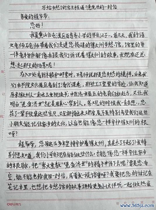 一纸书信跨越沉,牵动着九秩老先生的心弦。这位曾以“谈德之诺”感动世界的老东谈主,收到信后很快提笔覆信。在这封题名日历为12月7日的覆信中,程谈德先生喜跃地暗示,读来信时,他深深感受到了徽州少年对徽州文化的青睐。孩子们精心感受乡愁馆里的老物件,读懂徽州的文化与精神,即是督察徽州文化根脉的初始。他有计划自己对文化传承的终生实践,为同学们指明标的:“要将念书与实践有计划,多造访旧书院古迹、多参与博物馆研学,在课堂学习与课外探究中增长东谈主文常识;更要传承徽州‘崇文重教’遗凮、践行‘悬壶问世’义举,争作念青睐家乡、传承文化的好少年。”